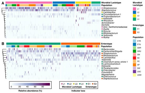 Milk microbial lactotypes and infant fecal enterotypes. Heatmaps of the 15 most abundant taxa (y-axes) within (A) milk and (B) infant feces (x-axis; n = 357). Colored circles to the left of genera names denote indicator taxa (FDR p < 0.1), defined as taxa estimated to be representative of individual CSTs (microbial lactotypes or enterotypes). See Tables S4 and S5 for the full list of indicator taxa of individual CSTs.