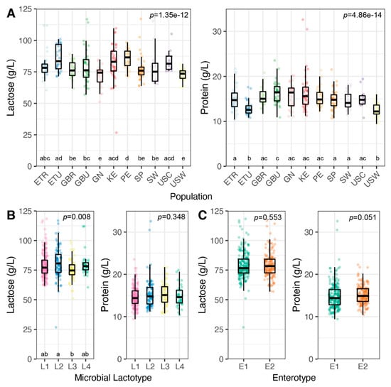 Concentrations of milk lactose and protein by population and community state type. Lactose and protein concentrations by (A) population of origin, (B) microbial lactotypes, and (C) enterotypes. p Values were calculated from Kruskal–Wallis test (followed by Dunn’s post hoc test; letters above the group names along the x-axes denote significance groups, p < 0.05).