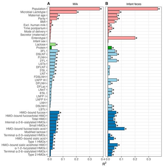 Associations between maternal/infant characteristics, milk factors, and microbial community structures of milk and infant feces. Envfit was used to model maternal and infant characteristics (pink), the concentration of milk lactose (light green), protein (dark green), and HMOs (individual HMOs in light blue, HMO groupings in dark blue) against (A) milk and (B) infant fecal microbial community structure (Bray–Curtis, NMDS; n = 340). Features along the y-axes in both panels are ordered based on the R2 values from the milk analysis, sorted within maternal/infant characteristics and milk factor groupings from highest to lowest R2. Significant features (FDR p ≤ 0.1) are denoted with an asterisk. 2′-fucosyllactose (2′FL), 3-fucosyllactose (3FL), lacto-N-neotetraose (LNnT), 3′-sialyllactose (3′SL), difucosyllactose (DFlac), 6′-sialyllactose (6′SL), lacto-N-tetraose (LNT), lacto-N-fucopentaose (LNFP) I, LNFP II, LNFP III, sialyl-LNT (LST) b, LSTc, difucosyllacto-LNT (DFLNT), lacto-N-hexaose (LNH), disialyllacto-N-tetraose (DSLNT), fucosyllacto-N-hexaose (FLNH), difucosyllacto-N-hexaose (DFLNH), fucodisialyllacto-lacto-N-hexaose (FDSLNH) and disialyllacto-N-hexaose (DSLNH); small HMOs (2′FL, 3FL, 3′SL, 6′SL, and DFLac), modified lactose (small HMOs and lactose), type 1 HMOs (LNT, LNFP I, LNFP II, LSTb, and DSLNT), type 2 HMOs (LNnT, LNFP III, and LSTc), α-1-2-fucosylated HMOs (2′FL and LNFP I), terminal α-2-6-sialylated HMOs (6′SL and LSTc), internal α-2-6-sialylated HMOs (DSLNT and LSTb), terminal α-2-3-sialylated HMOs (3′SL and DSLNT), ratio of HMO-bound sialic acid (Sia) to total HMOs (HMO-bound sialic acid/total HMOs), ratio of HMO-bound fucose (Fuc) to total HMOs (HMO-bound fucose/total HMOs), and ratio of the ratio of HMO-bound Fuc to HMO-bound Sia (HMO-bound fucose/HMO-bound sialic acid).