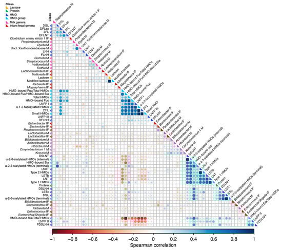 Correlations among microbial taxa and milk factors. Spearman rank correlations among milk (M) and infant fecal (IF) microbial taxa, lactose, protein, HMOs, and HMO groupings are shown (n = 340 paired dyads). Only correlations with FDR p ≤ 0.1 are shown. The size of the circle represents the magnitude of the correlation, and the color represents the direction of the correlation: red (negative) and blue (positive). Features were hierarchically clustered based on Spearman correlations. Feature classes are denoted by the colored squares next to the feature name on the left, as follows: light blue, individual HMOs; dark blue, HMO groupings; light green, lactose; dark green, protein; milk genera, pink; infant fecal genera, purple. 2′-fucosyllactose (2′FL), 3-fucosyllactose (3FL), lacto-N-neotetraose (LNnT), 3′-sialyllactose (3′SL), difucosyllactose (DFlac), 6′-sialyllactose (6′SL), lacto-N-tetraose (LNT), lacto-N-fucopentaose (LNFP) I, LNFP II, LNFP III, sialyl-LNT (LST) b, LSTc, difucosyllacto-LNT (DFLNT), lacto-N-hexaose (LNH), disialyllacto-N-tetraose (DSLNT), fucosyllacto-N-hexaose (FLNH), difucosyllacto-N-hexaose (DFLNH), fucodisialyllacto-lacto-N-hexaose (FDSLNH) and disialyllacto-N-hexaose (DSLNH); small HMOs (2′FL, 3FL, 3′SL, 6′SL, and DFLac), modified lactose (small HMOs and lactose), type 1 HMOs (LNT, LNFP I, LNFP II, LSTb, and DSLNT), type 2 HMOs (LNnT, LNFP III, and LSTc), α-1-2-fucosylated HMOs (2′FL and LNFP I), terminal α-2-6-sialylated HMOs (6′SL and LSTc), internal α-2-6-sialylated HMOs (DSLNT and LSTb), terminal α-2-3-sialylated HMOs (3′SL and DSLNT), ratio of HMO-bound sialic acid (Sia) to total HMOs (HMO-bound Sia/total HMOs), ratio of HMO-bound fucose (Fuc) to total HMOs (HMO-bound Fuc/total HMOs), and ratio of the ratio of HMO-bound Fuc to HMO-bound Sia (HMO-bound Fuc/HMO-bound Sia).