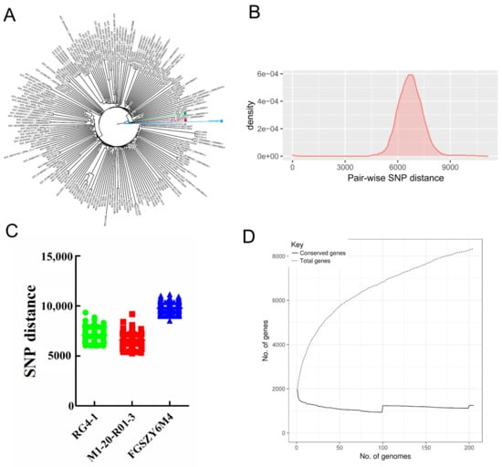 We also determined the number of variable SNPs in the core genomes of 205 B. longum strains (Figure 1B). The results indicated that the average SNP distance across the 205 strains was 6691. The most phylogenetically related strains exhibited an SNP distance of 0, while the most phylogenetically distant strains exhibited an SNP distance of 11,145. For each of the three novel B. longum strains, the minimum genetic distances between the respective strain and the other 204 strains in the dataset were 6000 (RG4-1), 5257 (M1-20-R01-3), and 8514 (FGSZY6M4). These data further confirm the genetic differences between each of these three B. longum strains and the other strains (Figure 1C). As shown in Figure 1D, the pangenome analysis indicated that accessory genes accounted for 85.1% of the total genes, and that new genes were accumulated frequently as new strains were added to the analysis.