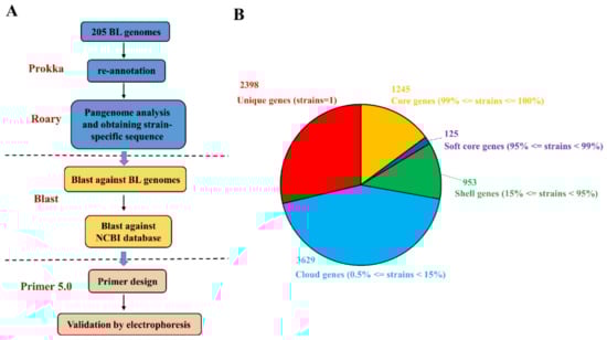 The analysis pipeline for strain-specific primer design corresponding to the three B. longum strains (A) and the pangenome readout (B).