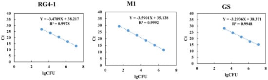 Primer specificity was evaluated by qPCR against a complex microbial community present in baseline fecal samples that had not been enriched for the target strain (i.e., pre-treatment). The DNA of each target B. longum strain was used as a positive control in the qPCR runs. Under optimized conditions, no amplification was observed for the baseline samples, whereas the positive controls exhibited good amplification. As shown in Figure 4, standard curves corresponding to RG4-1, M1-20-R01-3, and FGSZY6M4 exhibited good linearity over a 4-log range (103–107 CFU/qPCR system, R2 > 0.99), a 5-log range (101–106 CFU/qPCR system, R2 > 0.99) and a 4-log range (103–107 CFU/qPCR system, R2 > 0.99), respectively. The equations of the regression curves for RG4-1, M1-20-R01-3, and FGSZY6M4 were as follows: Ct = −3.4789lgCFU + 38.217, Ct = −3.5901lgCFU + 35.128, and Ct = −3.2936lgCFU + 38.371; and the corresponding amplification efficiencies were 93.8%, 90.0% and 101.2%, respectively. Collectively, the three qPCR primer pairs exhibited specificity in the context of the complex bacterial communities in fecal samples from both humans and mice, the standard curves used for absolute quantification were of good linearity, and the amplification efficiencies were qualified, suggesting that these primers can be used to detect the abundances of the target B. longum strains in fecal samples.