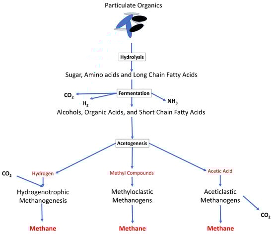 Microorganisms are abundant organisms in the environment that play essential roles in the sustainability of all life on the Earth []. Anaerobic digestion (AD) is an engineered process for biological waste management through the conversion of the organic feedstocks by microorganisms to produce biogas (i.e., a mixture of mainly methane and carbon dioxide) []. The AD process is a metabolic reaction consisting of four main steps in series (i.e., hydrolysis, fermentation or acidogenesis, acetogenesis and methanogenesis), where several types of anaerobic bacteria and archaea interact together to produce biogas (Figure 1) [,,,]. Moreover, the AD process is strictly dependent on the activity of the microorganisms, and its efficiency is affected by critical interactions between the microorganisms (i.e., known as syntrophic activities (which can be defined as close cooperation between at least two organisms based on the transfer of metabolic products from one to another)) within the digester [,].