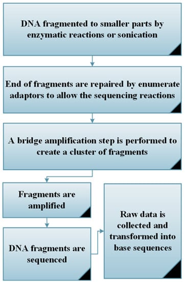 Unlike traditional sequencing technologies, recently developed sequencing technologies, known as high-throughput techniques or next-generation sequencing (NGS), are capable of sequencing multiple DNA molecules simultaneously with low cost, short processing times and high resolution []. These features lead to the generation of large data sets that can enhance the statistical correlation analysis []. Six main steps are adapted for NGS techniques as shown in Figure 2 [].