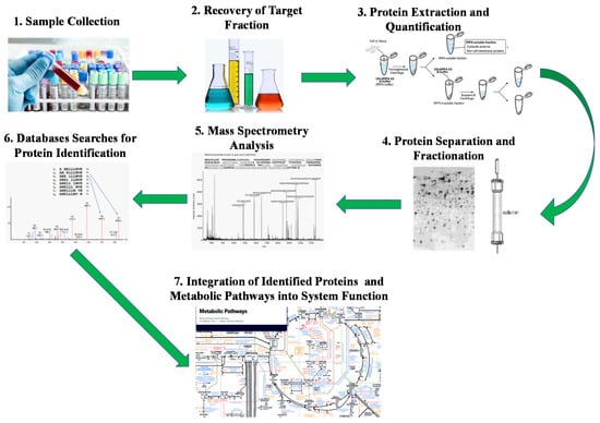 Wilmes and Bond [] have defined meta-proteomics as the identification of all the expressed proteins at a given time within an ecosystem under a specific condition (e.g., soil, sediments, marine and freshwater, anaerobic environments, human body and animal guts). Metaproteomic approaches are based on six main steps (Figure 3). The metaproteomic analysis methods include all data extracted from metagenomics, diversity and functional diversity information and identified biological processes in order to define the metabolic activity and biological pathways of the microorganisms along with their cooperation and competition []. Siggins et al. [] gives an extensive overview of this process, and the sampling and analysis method for AD samples have been described by Heyer et al. [].