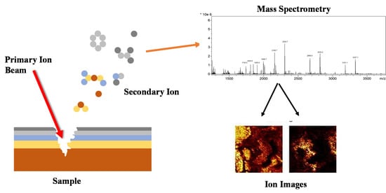 SIMS is a sensitive mass spectrometric technique that measures elemental, isotopic or molecular composition of a solid surface. Initially, SIMS employs an ion gun to produce an ionic beam and generates secondary particles including atoms and molecules (depending on SIMS mode) from the surface of the organism in a high vacuum []. Figure 4 gives a schematic representation of the SIMS method. Modern SIMS-based instruments (i.e., NanoSIMS) are capable of measuring up to seven elements or isotopes simultaneously.