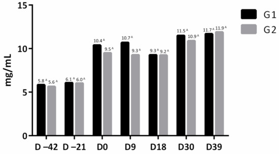 Regarding the hematimetric index, significant differences were observed in the MCV and MCH values between groups G1 and G2 at D–42 and in MCHC values at D–42 and D–21. However, these values remained within the range considered normal for swine species. No differences were observed in number of platelets of the animals from two experimental groups (Table S1).
