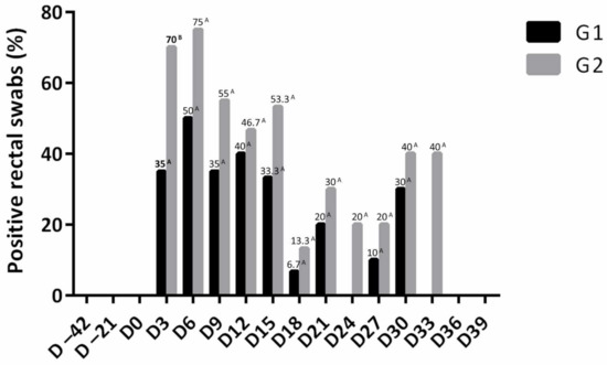 Animals from G1 showed lower percentages of positive samples for Salmonella Typhimurium during the evaluation period, with a significant difference in D3 (G1: 35.0% and G2: 70.0%). Of the 220 rectal swabs analyzed in each experimental group, it was possible to perform the microbiological isolation of Salmonella Typhimurium in 42 samples from animals of G1 (19.1%) and 70 samples from animals of G2 (31.8%), with a significant difference between groups (p < 0.05) (Table S3 and Figure 2). It was also observed that from the 6th day after inoculation until the 10th day, most animals were excreting Salmonella, suggesting a possible peak of excretion (Figure 2).