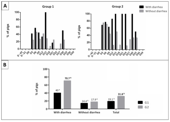 Percentage of positive rectal swabs samples for Salmonella Typhimurium, according to the consistency of the feces. (A) Vaccinated animals (G1) and non-vaccinated animals (G2). (B) Comparison between the averages in pigs with and without diarrhea, and the total. Values followed by the same letter do not differ from each other by the chi-square test (p > 0.05).