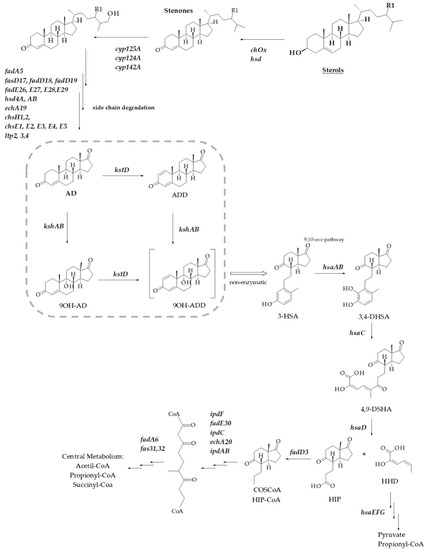 Sterols and related steroids are widespread in nature due to their important physiological activities that vary from their structural role in the eukaryotic membrane to their action as hormones. These molecules are highly resistant to degradation due to their hydrophobic nature and reduced presence of functional groups; nevertheless, it is possible to find bacteria that can degrade steroid compounds [1]. Several species of actinobacteria, including Mycobacterium and Rhodococcus, are able to grow on steroids such as cholesterol (CHO), phytosterols, androgens, bile acids or estrogens as sole carbon and energy source [2,3,4,5,6]. Although different pathways for aerobic or anaerobic steroid degradation may co-exist in the same organism, the role and participation of steroid genes involved in cholesterol catabolism have been clarified by biochemical and genetic studies [1,3,4,5,7,8,9,10]. A generalized microbial steroid 9,10-seco catabolic pathway scheme is depicted in Figure 1. The genome search for catabolic steroid genes encoding clusters has resulted in important advances in metabolic engineering and sterol bioconversion of both Rhodococcus and Mycobacterium [3,11,12,13,14,15]. These findings have allowed the production of valuable steroid intermediates such as 9α-hydroxyandrost-4-ene-3,17-dione (9OH-AD), 4-androstene-3,17-dione (AD), 1,4-androstadiene-3,17-dione (ADD) or 22-hydroxy-23,24-bisnorchol-1,4-dien-3-one (1,4-HBC) [16,17,18,19]. Some of these steroids or their derivatives are used for medical purposes in humans, livestock and aquaculture [20].