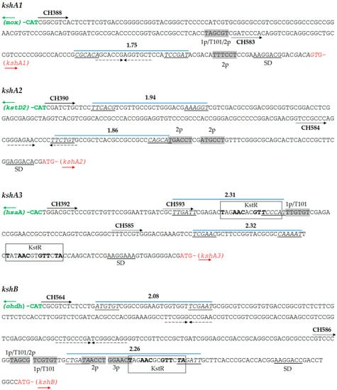 Subsequently, we searched for ribosomal binding site (RBS) sequences in the ksh intergenic regions. It is reported that some steroid genes such as kstD3 ORF are leaderless and do not display an RBS [32], and, therefore, we analyzed if this was also the case in the kshA promoters. As reference, we used the synthetic RBS AAGGAGG that has been proved to be effective in the Gram-positive Streptomyces [41] and also the strongest RBS found for effective expression of genes in actinobacteria: (AA)GGA(G)G(AA)A(AAA)CAT-ATG [42]. In the analyzed ksh Rhodococcus intergenic fragments, this RBS was partially found in all cases at different distances from the initial codon (Figure 2 and Figure S1). The analysis in silico of these intergenic regions by PhiSITE yielded putative cis-regulatory signals -35 and -10 for prokaryotic promoter that are depicted in Figure 2. In parallel, as the absence of a -35 motif seems to be a characteristic of actinobacterial promoters [43,44], we also searched for -10 regions similar to those described for kstDs Rhodococcus promoters [32] and mycobacterial promoters [43]. It must be noted that one of these promoters, the Rhodococcus kstD1p (TAGTGT), is identical to the -10 T101 promoter described for mycobacteria [43].