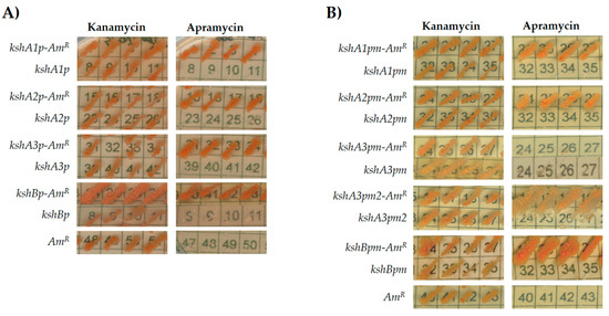 Comparative assessments of R. ruber ksh promoters: (A) intergenic regions; and (B) reduced promoter regions. Cells of R. ruber strain Chol-4 harboring different recombinant plasmids were grown on LB in the presence of either kanamycin (200 μg/mL) or apramycin (300 μg/mL). Abbreviations: kshA/Bp, pNVS vector containing the putative promoter region; kshA/Bp-AmR, pNVS vector containing the putative promoter region in frame to the apramycin gene; kshA/Bpm, pNVS vector containing the putative minimal promoters; kshA/Bpm-AmR, pNVS vector containing the putative minimal promoter coupled to the apramycin resistance gene; AmR: pNVS, vector containing the apramycin resistance gene without any promoter.