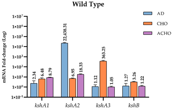 RNA samples were prepared from cultures grown on M457 mineral medium supplemented with sodium acetate (used as substrate control), AD and CHO as source of energy and carbon. WT was additionally grown on ACHO. Values obtained for the expression of the kshA or kshB genes in sodium acetate in all the strains tested were considered as the baseline expression with a value of 1. We found that, in WT strain, genes kshA and kshB were constitutively transcribed under all the conditions tested in our assays at a basal level. However, in the presence of CHO, AD or ACHO, they were specifically upregulated. In fact, WT cells growing on AD showed a 22,438-fold increase of kshA2 transcription response, the highest induction of all genes and conditions tested, while kshA3 almost did not present any fold change (1.12) and kshA1 showed a slight (2.34-fold) change (Figure 4). These data confirm that the presence of the KshA2 isoenzyme is strongly reinforced in R. ruber AD catabolism while KshA1 is mildly induced.