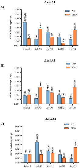On the other hand, kstD3 levels practically remained equal in the three mutants (2.4-, 1.6- and 0.8-fold change, respectively, compared to 0.6-fold change in the WT, Figure 5). This fact makes sense due to the KstD3 involvement in CHO rather than in AD catabolism.