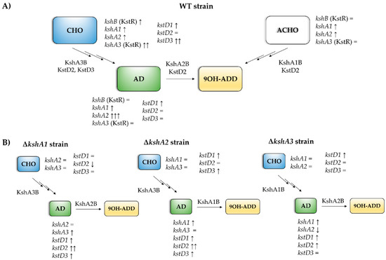 The results suggest that there is an interaction between KshABs and KstDs as the lack of any KshA has an impact on the expression of most kstDs depending on the steroid. On AD, kstD1 and kstD2 are upregulated, while in the case of CHO the regulation is more complex.