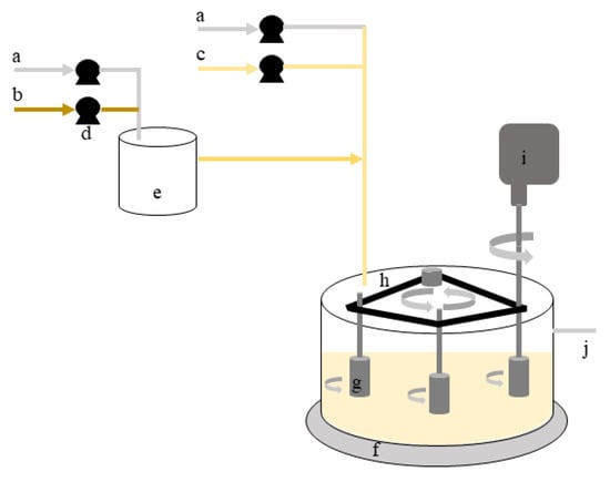 Scheme representative of the rotating cylinder reactor: (a)—inlet of sterile air; (b)—inlet of concentrated nutrient medium; (c)—inlet of diluted nutrient medium; (d)—peristaltic pumps; (e)—chemostat; (f)—rotating cylinder reactor; (g)—testing cylinders (samplers); (h)—synchronising belt that connect the three cylinders; (i)—stirrer that controls rotation speed; (j)—outlet of bacterial suspension.