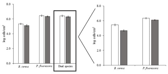 Number of B. cereus and P. fluorescens in single- and dual-species adhered on HDPE surface, before (□) and after (■) BDMDAC treatment. Mean values ± SDs for at least three replicates are illustrated.