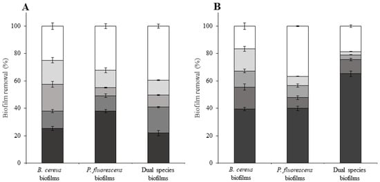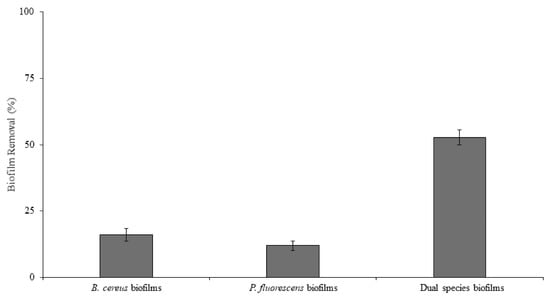 Biofilm removal after submitting the B. cereus, P. fluorescens, and dual-species biofilms to BDMDAC at 300 µg/mL under 0.04 Pa. Mean values ± SDs for at least three replicates are given.