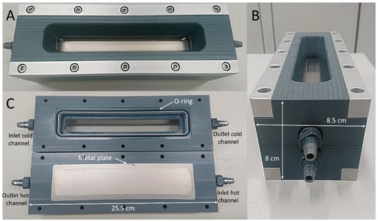 The laboratory heat exchanger modules were designed as single plate heat exchangers. This design was selected due to its convenience for laboratory experiments, allowing easy access to cold and hot channels, and visual monitoring. The flat plate surface facilitates collection of biofilms. Modules were made of two identical PVC elements, fitting each other, and separated by a single metal plate (Figure 1). PVC connectors built in each side of the channels allowed connections to tubing. Diffusers were included in the geometry of the channels to provide a homogeneously distributed flow. O-rings were placed on each side of the metal plate to tightly maintain the plate and separate the water from each channel. Corrosion-resistant metal, Hastelloy C-22, was used for the metal plate. L × W × H dimensions were as follows: 189 × 34 × 8 mm3 for the channels and 189 × 34 × 1 mm3 for the plate. Two identical modules were produced by STT Products BV and operated simultaneously during our experiments. The technical drawing of the modules is provided in the Supplementary Materials (Figure S1).