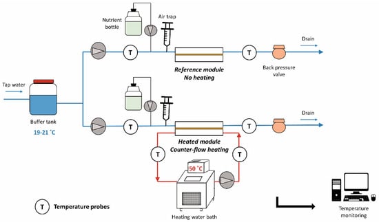 In all experiments, one module was operated in single-pass flow without heating, denoted as “reference module”, and a second module was operated in counter-flow with continuous heating, denoted as “heated module”. The cold channel of each module was fed with tap water at a temperature of 20.0 ± 1.4 °C and a flow rate of 0.18 L/min. A nutrient solution composed of sodium acetate trihydrate (CH3COONa·3H2O; for a ‘C’ source), sodium nitrate (NaNO3; for a ‘N’ source) and sodium phosphate monobasic monohydrate (NaH2PO4·H2O; for a ‘P’ source) was dosed to enhance biofilm growth. The concentrations in elements C, N and P were maintained at 500, 100 and 50 µg/L, respectively, in the feed water, corresponding to a mass ratio C:N:P of 100:20:10 [21]. The second channel of the heated module only was operated with recirculating water at 50 °C at a flow rate of 1.8 L/min, without nutrient dosage. The full laboratory set-up is illustrated in Figure 2. Biofilms were grown over a period of 40 days. The experiments were performed in triplicate, denoted as “Experiments 1, 2 and 3”.