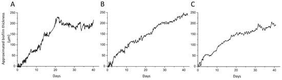 Approximated thickness of the biofilms monitored in the heated module over the duration of Experiment 1 (A), Experiment 2 (B), and Experiment 3 (C).
