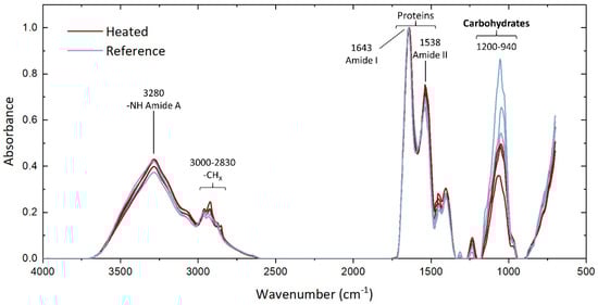 The FTIR spectra of the extracted EPS samples display the protein band at 1500–1700 cm−1 with the peaks corresponding to C=O and C-N groups of amide I and N-H, C-N, and C-C groups of amide II [28]. The characteristic carbohydrate band is visible at 940–1200 cm−1, corresponding to stretching vibrations of C-O in C-OH and C-C group [29,30]. The comparison of spectra indicates high similarity in molecular vibrations with a large overlapping fraction of the curves of the extracted EPS from the heated and reference modules. Only the carbohydrate peak does not overlap (Figure 5), with a striking divergence between both conditions. A lower absorbance intensity is observed in the EPS grown under heated conditions, suggesting that a relatively lower sugar content of the EPS was produced at elevated temperature.