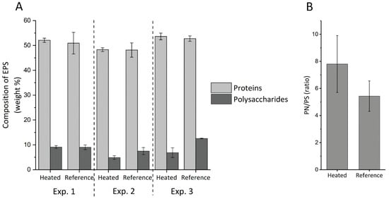 Composition of EPS in weight percentages of polysaccharides and proteins in the heated and reference modules (A) and protein-to-polysaccharide (PN/PS) ratio under both conditions, averaged over the triplicate experiments (B). The error bars indicate the standard deviations.