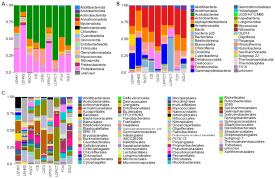 Overview of bacterial diversity at eight caves in Great Basin National Park inferred from environmental DNA metabarcoding of partial 16S amplicons. Bar plot depicts the relative proportion of reads assigned to different taxonomic ranks—each column represents a sampled cave (see Table 1). (A) The proportion of 16S reads assigned to phylum-level groups, inferred using the FROGS pipeline, for each cave. (B) The proportion of 16S reads assigned to class-level groups, inferred using the FROGS pipeline, for each cave. (C) The proportion of 16S reads assigned to order-level groups, inferred using the FROGS pipeline, for each cave. The show cave with artificial lighting, Lehman Caves, was represented by two composite samples: “LEHM 1” collected in May 2019 from 10 sites within the cave; and ‘LEHM 2′ collected from five sites within the cave in November 2019. Note: in panel (C), the color pattern repeats starting with the order “Micropepsales” and the repeat is indicated with a white asterisk in each stacked bar plot.