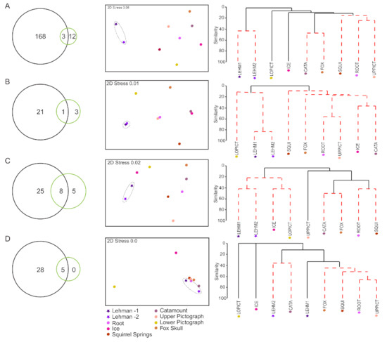 Photoautotrophic communities in GRBA caves were generally highly dissimilar (Figure 5). Cyanobacteria, diatoms, and algae OTU diversity in Lehman Caves is only a partial subset of the composite OTU diversity occurring in wild caves (Figure 5, Venn diagrams). The majority of cyanobacteria and diatom OTUs occurring in Lehman Caves were not sampled in any of the wild caves in GRBA investigated for this study (Figure 5A,B, Vennn Diagrams). Similarly, five of the eight algal OTUs from Lehman Caves were not found in the nearby wild caves (Figure 5C, Venn diagram). In contrast, all bryophyte OTUs occurring in Lehman Caves were also found in the nearby wild caves (Figure 5D, Venn diagram). NMDS analyses corroborated the inference of highly dissimilar photoautotrophic communities among sampled caves (Figure 5, nMDS plots). The two composite Lehman Caves lampenflora samples were also shown to be distinct from the wild cave samples, with the exception of the bryophyte component, and generally more similar to each other (Figure 5).