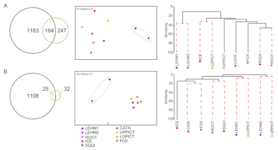 - Mahé, F.; Rognes, T.; Quince, C.; de Vargas, C.; Dunthorn, M. Swarm: Robust and fast clustering method for amplicon-based studies. PeerJ 2014, 2, e593. [Google Scholar] [CrossRef] [PubMed]