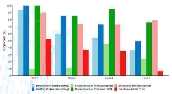 Overview of the proportions of the 259 fecal DNAs from pigs from four different herds in Denmark positive for five parasitic genera, according to herd. For Balantioides, Blastocystis, and Entamoeba, only metabarcoding was used. For Giardia and Cryptosporidium, both metabarcoding and real-time PCR were used (Giardia failed to be detected by the metabarcoding assay).