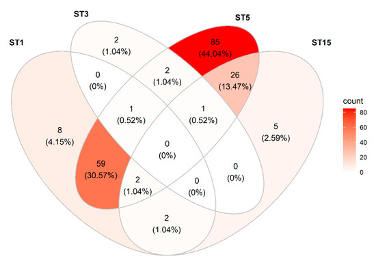 Venn diagram showing the distribution and co-occurrence of Blastocystis sp. subtypes detected in the study of fecal DNAs from pigs from four different herds in Denmark.
