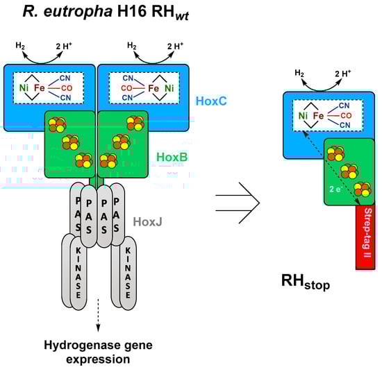 The β-proteobacterium Ralstonia eutropha H16 (also named Cupriavidus necator) harbors four different O2-tolerant [NiFe]-hydrogenases; the membrane-bound hydrogenase (MBH), the soluble NAD+-reducing hydrogenase (SH), the actinobacterial-like hydrogenase (AH), and the regulatory hydrogenase (RH) []. Here, we focus on the RH that functions as H2 sensor regulating the expression of energy-converting MBH and SH proteins []. In addition to the RH heterodimer, consisting of the HoxB and HoxC subunits, the H2-sensing two-component regulatory system includes the histidine kinase HoxJ and the response regulator HoxA [] (Figure 1). Considering the high complexity of the RH system depicted in Figure 1, many in vitro studies, e.g., EPR [], IR [,,], Mössbauer [], resonance Raman (RR) [], and nuclear resonance vibrational (NRVS) [] spectroscopy, have been carried out on a truncated version of the protein (RHstop, Figure 1 right side), which allows for the isolation of the single HoxBC heterodimer [,]. Nevertheless, relatively low protein yields of 0.01–0.1 mg of purified enzyme per L of culture have been reported for both homologous (R. eutropha) [,,] and heterologous (E. coli) [] RHstop production.