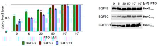 Heterologous overproduction of Hox proteins from plasmids pQF4, pQF5, or pQF8 in E. coli BL21-Gold (BQF4B, BQF5C, or BQF8RH). Cells were cultivated in TB medium in deep-well plates at 37 °C as described in Materials and Methods. RH production was induced with varying IPTG concentrations. HoxB production was analyzed by Western blotting (normalized to OD600) with Strep-tag antibodies (right part) and subsequent quantification of the bands using ImageJ. For each strain, protein amounts were calculated relative to the amount of protein at a maximum inducer concentration of 1 mM IPTG.