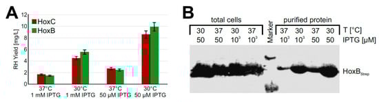 First expression experiments using E. coli strains TQF4B, TQF5C, or TQF8RH (E. coli TG1 carrying plasmids pQF4, pQF5, or pQF8, respectively) were performed at 37 °C in shake flasks containing TB complex medium. In all cases, the hoxB and hoxC genes were overexpressed and the corresponding proteins could be purified by affinity chromatography (Figure S2), demonstrating the functionality of these plasmids. The bands corresponded to the calculated theoretical molecular masses of 32 kDa, 54 kDa, and 52 kDa for HoxBStrep, HoxCStrep, and untagged HoxC, respectively. In case of HoxB, however, the yield was comparatively low and a second band directly below HoxB was detected in the preparation from TQF4B, which might indicate proteolytic degradation of HoxB as recently shown (Figure S2) []. This was confirmed by immunoblotting, as both bands reacted with the anti-Strep-tag antibody. Nonetheless, the second HoxB band was not observed in RH samples purified from stain TQF8RH, possibly due to the presence of HoxC that might help to protect HoxB from degradation. Moreover, in all samples of purified Hox proteins, a prominent additional band with a size of approximately 60 kDa was visible.