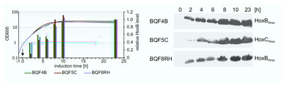 The determination of the optimal expression time is also important to increase the overall productivity of the process. To address this question, the Hox protein production levels were investigated in TB batch cultures of strains BQF4B, BQF5C, and BQF8RH, respectively. Hox protein production was induced by addition of 50 µM IPTG at OD600 of approximately 0.8, and the amount of produced Hox protein at different time points was analyzed by Western blotting (Figure 4). As expected, the Hox protein level increased during the first 10 h after induction for all three strains. The highest amount of total Hox protein was reached after 10 h of induction (Figure 4). No further increase in protein level was detected in TB batch cultivations upon prolonged induction for 23 h at the time when the cell growth also stopped (Figure 4). Consequently, the way to obtain high cell densities by prolonged cell growth, rather than prolonged induction time, is to increase HoxBC production, which is the subsequent aim of this study.