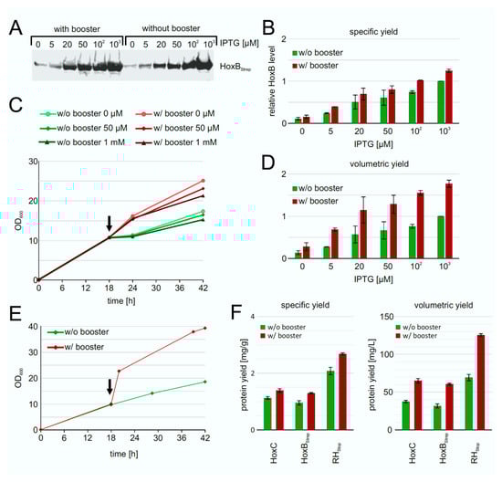 To improve the RH production performance of strain BQF8RH, we used the EnPresso B growth system [,] with or without addition of booster tablet and a second dose of glucoamylase (EnPresso GmbH, Germany) prior to induction. After growth for 18 h, gene expression was induced trough IPTG addition in concentrations ranging from 0–1 mM. Equal amounts of cells were harvested after 24 h of induction, and the individual HoxB levels were determined by Western blotting (Figure 5A). In both boosted and non-boosted cultures, respectively, increasing inducer concentrations resulted in increasing HoxB levels (Figure 5B), as already observed in TB complex medium (Figure 2). As illustrated in Figure 5B, both the boosted and the non-boosted cultures show comparable maximum HoxB yields at the highest inducer concentration. Interestingly, about 90% of the maximum HoxB yield was already attained with 50 µM IPTG in the boosted Enpresso B culture, whereas only about 45% of the maximum HoxB yield was reached in the non-boosted culture upon induction with 50 µM IPTG, indicating a positive effect of the booster on RH production at lower inducer concentration. In contrast to the batch cultivation, less leaky expression was observed in the EnPresso cultures without induction (compare Figure 2 and Figure 5). Not surprisingly, due to the glucose-limited growth, the non-boosted cultures reached final OD600s that were approximately 1.5-fold lower compared to the boosted cultures (Figure 5C). Consequently, the volumetric RH yield was about 2-fold higher in the boosted compared to non-boosted cultures (Figure 5D). A similar result of an about 2-fold increase in cell density was observed in 50-mL UYF cultures with and without booster (Figure 5D). In contrast to non-boosted cultures, the soluble RH yield per cell was slightly increased in boosted cultures, whereas approximately 2-fold higher volumetric RH yield was obtained largely due to the overall increase in the cell density (Figure 5E,F). Our results indicate that the fed-batch like growth system is suitable for inducer-dependent RH production in E. coli through an automated, enzyme-based glucose-release into the cultures.