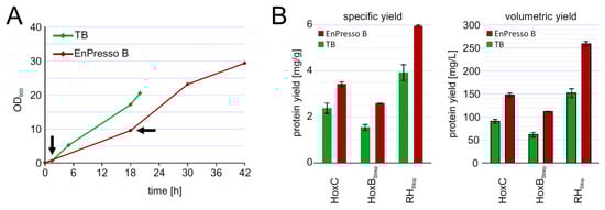 To investigate the reproducibility of the batch und fed-batch like cultures during scale-up, we performed shake flask cultures in 2.5-L UYF with a broth volume of 500 mL (20% v/v) under optimized conditions of inducer concentration, temperature, and production strain. At the end, the cells grew slower in 2.5-L UYFs most likely due to lower oxygen transfer coefficient (KLa) values (at least 3.5-times lower) than that in 250-mL UYFs []. Interestingly, the slower growth positively affected RH production in both media. We were able to achieve RH yields of 4 mg/g cell wet weight in TB and even 6 mg/g in boosted EnPresso medium (Figure 6B). The final titer was increased up to approximately 255 mg/L in EnPresso cultivations, which represents a 2-fold higher yield compared to the 500 mL TB batch culture (Figure 6) and a 2-fold increase compared to the 50 mL EnPresso cultures (Figure 5F). From these results, we conclude that a good scalability of RH production could be achieved over the shake-flask scales (250 mL vs. 2.5 L shake flasks) in terms of the volumetric and specific protein yields. A lower KLa value may seem to be advantageous for scale-up and facilitate RH production.
