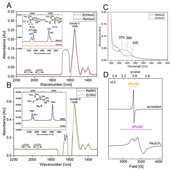 Comparative spectroscopic characterization of RH and isolated HoxC purified from R. eutropha and E. coli. (A) Comparison of IR spectra of as-isolated HoxC produced from E. coli (EcHoxC, red line) and R. eutropha (ReHoxC, black line). (B) Comparison of IR spectra of as-isolated RHstop produced from E. coli (dark yellow line) and R. eutropha (black line). (C) Comparison of UV-vis absorption spectra of 20 µM as-isolated HoxC produced from E. coli (red line) and R. eutropha (black line). The spectrum of E. coli-derived HoxC shows only minor absorptions around 420 nm, probably related to heme-containing protein contaminants copurified with the large subunit. HoxC from R. eutropha shows active site contributions characterized by two absorption bands at 370 and 390 nm []. (D) EPR spectra recorded at 10 K with a microwave power of 1 mW of as-isolated RHstop (0.2 mM) from E. coli (top trace), containing minor contributions of a [3Fe–4S]+ cluster species, in line with data recorded of native RH []. The bottom trace represents reduced RHstop treated with an excess of sodium dithionite. The spectrum contains rhombic signals attributed to a [4Fe–4S]+ cluster. The asterisk (*) denotes a weak signal, deriving presumably from a [2Fe–2S] cluster subspecies originating either from partial [4Fe–4S] cluster degradation or from protein contaminants. Spectra in A, B are normalized to the amide II band intensity at 1548/cm.