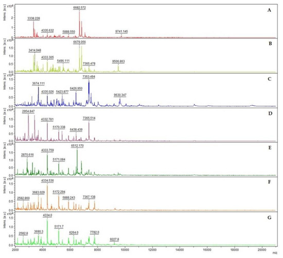 MALDI-TOF mass spectra of seven different Bacillus species in the mass range of 2 to 20 kDa: B. anthracis (A), B. cereus (B), B. mycoides (C), B. thuringiensis (D), B. toyonensis (E), B. weihenstephanensis (F) and B. wiedmannii (G). The mass spectra were obtained using the FlexAnalysis software (v. 3.4, Bruker Daltonik GmbH, Bremen, Germany), performing baseline corrected, smoothed and normalized analyses. The mass spectra demonstrate a relatively high signal-to-noise ratio, which typically permits the detection of 50 to 100 mass peaks per spectrum with the signal-to-noise ratio higher than 3.