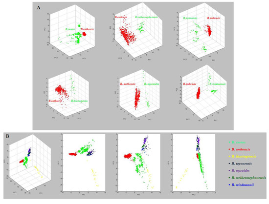 (A) Statistical comparison by PCA between mass spectra of B. anthracis and of other species belonging to the B. cereus group. (B) PCA grouped the analysed isolates into 7 different clusters.
