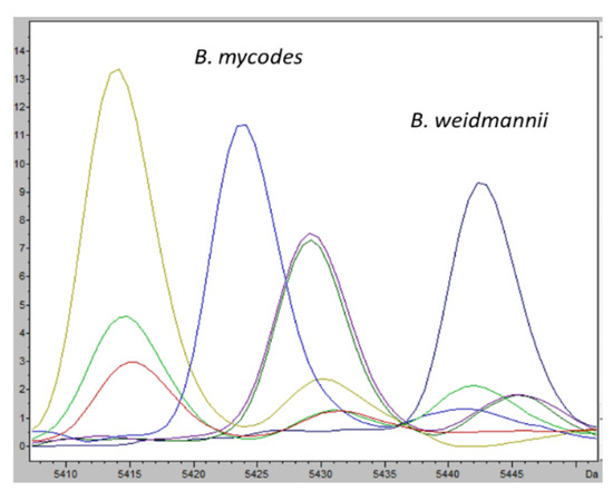 The same statistical approach was used for B. mycoides and B. wiedmannii and only one characteristic ion peak was found, in the mass range between 5410 and 5450 as mass-to-charge ratio; the ion peaks selected well defined the two species (Figure 5).
