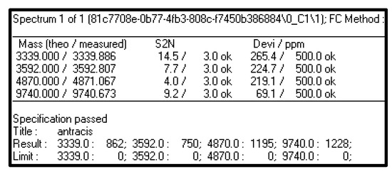 In Figure 6, the result obtained after the automatic algorithm run in FlexAnalysis software (v. 3.4, Bruker Daltonik GmbH, Bremen, Germany) is shown. It refers to the algorithm used for B. anthracis species, the more complex one, due to the number of the ion peaks. In the example, all the four characteristic ion peaks were found with a low deviation error in term of ppm; in fact, in the result, “Specification passed” is shown. It means that the experimental spectrum can be identified now as B. anthracis with no limitations as before.