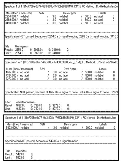 Unfortunately, the main spectra profiles for B. toyonensis and B. weidmannii are enough different from the MSPs of other species contained in the library but too much similar between them, consequently a further algorithm is needed.