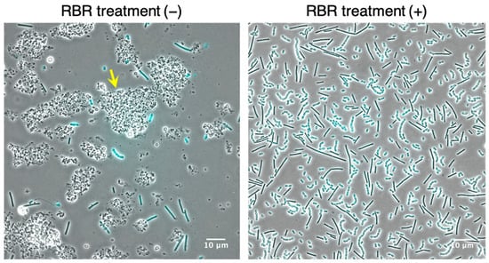 Removal of impurities in milk by RBR treatment. Microscopic images of DAPI-stained LAB cells collected from 8.0 h-fermented yogurt with and without the RBR treatment. Arrow indicates aggregated impurities.