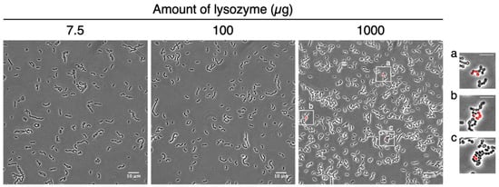 In our previous report, we successfully extracted total RNA from Brevibacillus cells, which were used as a model of the Gram-positive bacteria, using the same procedure at 7.5 µg of lysozyme for Escherichia coli as the Gram-negative model bacteria [15]. In contrast, the homogenization of LAB cells (also Gram-positive) was performed by either adding glass beads [17,24] or hard vortex [17,20,24] before total RNA isolation. These reports suggest that the cell walls of LAB cells are stronger than those of the Brevibacillus cells. Therefore, we confirmed the optimal amount of lysozyme for permeabilization required for in situ detection of LAB mRNA. LAB cells fermented for 3.5 h were treated with different amounts of lysozyme (7.5, 100, and 1000 µg) before performing RHa-RCA-FISH using PLP for pflA mRNA (Figure 2). As a result, the bright fluorescent signals that originated from the Alexa568-labeled detection probes were specifically observed from a subset of S. thermophilus cells following treatment with 1000 µg of lysozyme (Figure 2, right image), whereas no signal was observed in cells treated with 7.5 and 100 µg of lysozyme (Figure 2, left and middle images).