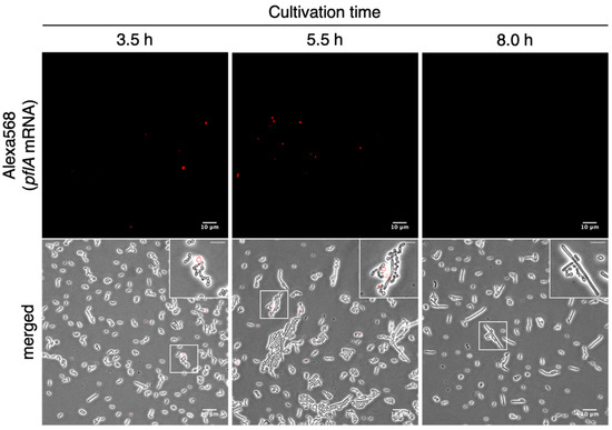 Monitoring of the temporal transition of pflA mRNA expression in S. thermophilus. Lower images show overlays of the phase contrast (grayscale) and Alexa568-labeled probes (red). Fluorescent signals were difficult to recognize in the merged images because intense light passed through the cells. Therefore, pre-merged images showing fluorescent signals (upper images) are also shown. Insets in the upper right of each merged image are magnified images of the boxes; LAB cells in which fluorescent signals were detected (3.5 h and 5.5 h) and not detected (8.0 h). Scale bars, 10 µm in large images and 5 µm in magnified images.
