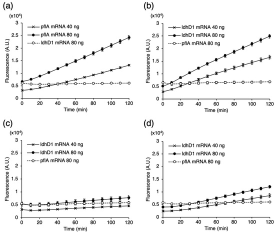 Comparison of the detection sensitivity of PLP-ldhD1 by real-time RHa-RCA. (a) Amplification plots of pflA mRNA detection using PLP-pflA. (b–d) Amplification plots of ldhD1 mRNA detection using PLP-ldhD1s; the figures represent Probes #1, #2, and #3, respectively. For each probe, 80 ng of non-target IVT mRNA (ldhD1 mRNA for PLP-pflA and pflA mRNA for PLP-ldhD1) was used as a negative control.