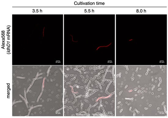 Yogurt is a simple microbial consortium comprised of two lactic acid bacteria (LAB). Streptococcus thermophilus and Lactobacillus delbrueckii subsp. bulgaricus (L. bulgaricus) form a syntrophic relationship that has been well studied [16,17,18,19], and transcriptome data are available [17,20]. As a model consortium, we performed RHa-RCA-FISH against the mRNA of the pyruvate-formate lyase-activating enzyme gene (pflA) of S. thermophilus in our previous report [15]. According to Sieuwerts et al. [17], L. bulgaricus lacks a pyruvate-formate lyase and the enzyme or formate is provided by S. thermophilus. Thus, pflA is activated in the early logarithmic phase at 4.06-fold in the expression ratio (mixed culture/monoculture) and suppressed in the middle and late phases at 0.47–0.79-fold. However, LAB grow buried in impurities, including protein (casein) precipitates [21,22]. We could only perform RHa-RCA-FISH in the early phase of cultivation because of the large amount of precipitated casein that prevented LAB cell harvest from yogurt.